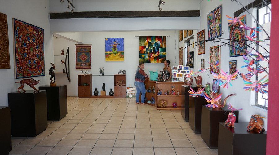 Colectika offers folk and indigenous Mexican art, including Huichol beadwork, yarn paintings, alebrije wood carvings from Oaxaca, ceramics, wool rugs, and contemporary and regional paintings.