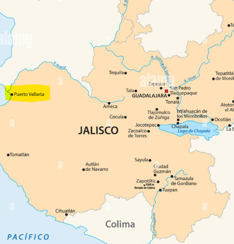 Map showing the location of Puerto Vallarta on the Pacific coast of Mexico within the state of Jalisco. This is just an example image.